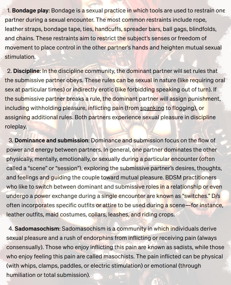If you are new to BDSM, consider these steps:Educate yourself: Read books, articles, and blogs, or take workshops on BDSM.Start small: Begin with activities that are less intense and gradually explore more complex dynamics as you gain experience.Find a mentor or experienced play partner: Learn from someone who has experience with BDSM and can help guide you.Join a local BDSM community: Connect with like-minded individuals and find support and resources.